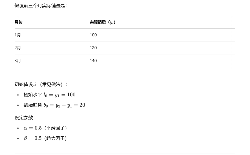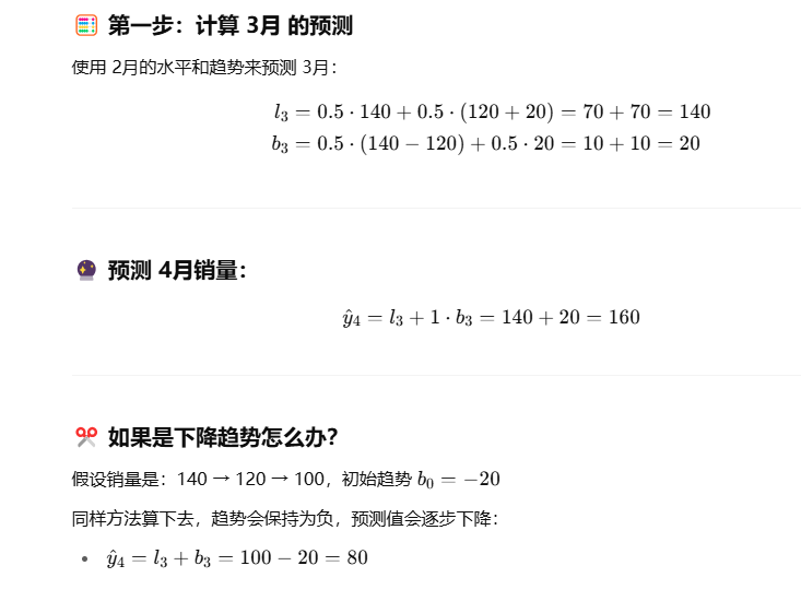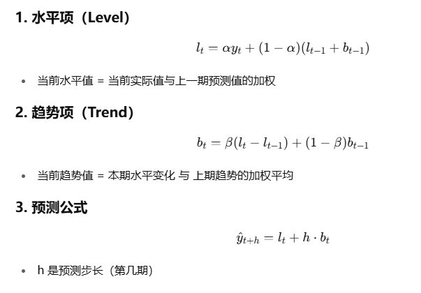 在「基础的指数平滑」上,再加上一层「趋势项」的建模,使模型能识别并外推上升或下降趋势。